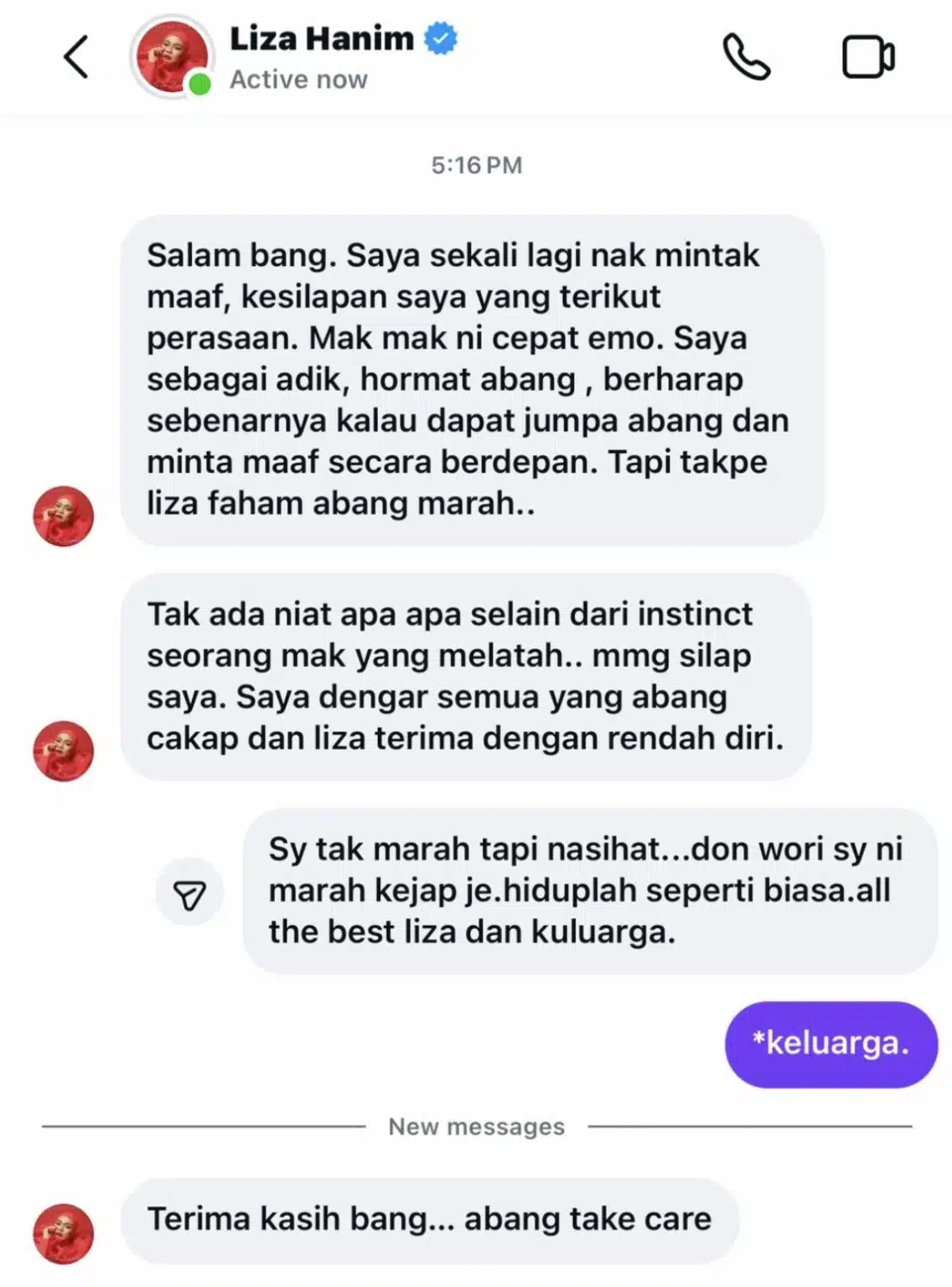Menurut perkongsian tangkap layar mesej oleh isteri Ameng, Sabariah Zakariah di Instagram, Liza tampil mengambil langkah berani dengan memohon maaf secara peribadi. Jelas kelihatan, penyanyi bersuara emas itu tidak berselindung, malah terus terang mengakui dirinya terikut emosi ketika isu tersebut tercetus.