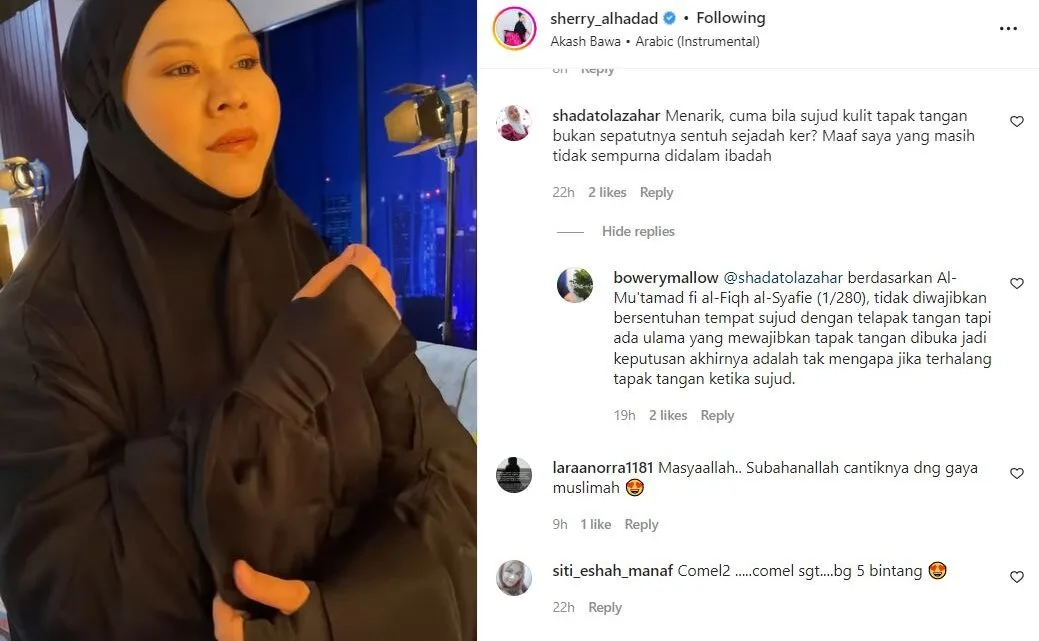 Baru-baru ini Sherry Alhadad ada berkongsikan satu video di Instagram miliknya kepada netizen mengenai pakaian yang digunakan olehnya untuk bersolat.