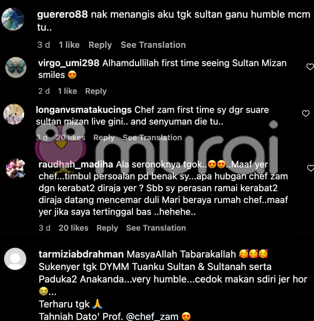 Di ruangan komen, rata-rata netizen meluahkan rasa kagum setelah melihat video-video yang dimuatnaik oleh Chef Zam saat Tuanku beraya di rumahnya. Ada yang pertama kali melihat Tuanku tersenyum lebar kerana Baginda sering dilihat begitu serius ketika berada di majlis rasmi.