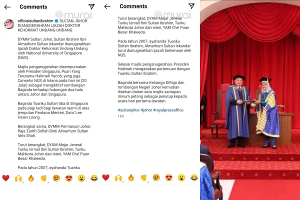 Murai MY menjengah ke Instagram pemerintah negeri Johor ini dan mendapati Sultan Ibrahim dianugerahkan Ijazah Doktor Kehormat Undang-Undang oleh National University of Singapore (NUS) pada 20 Julai semalam.
