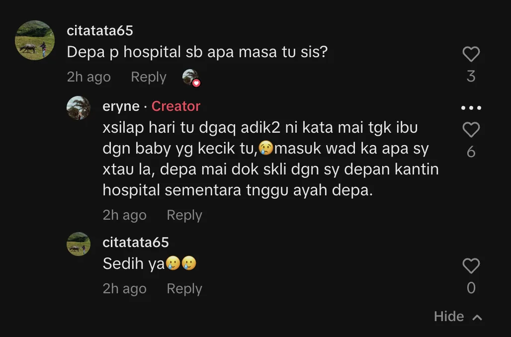 “Xsilap hari tu dgaq adik2 ni kata mai tgk ibu dgn baby yg kecik tu, 😢 masuk wad ka apa sy xtau la, depa mai dok skli dgn sy depan kantin hospital sementara tnggu ayah depa.”