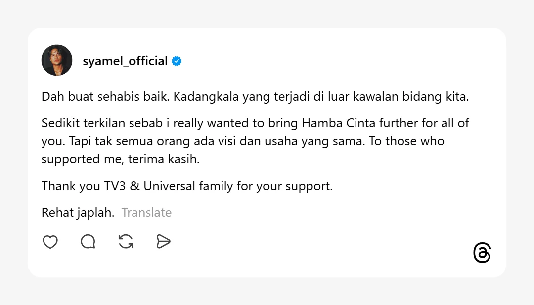 Kepada semua yang menyokong saya, terima kasih. Terima kasih TV3 dan Universal Music Malaysia. Rehat jap lah.”-tulis Syamel di Thread