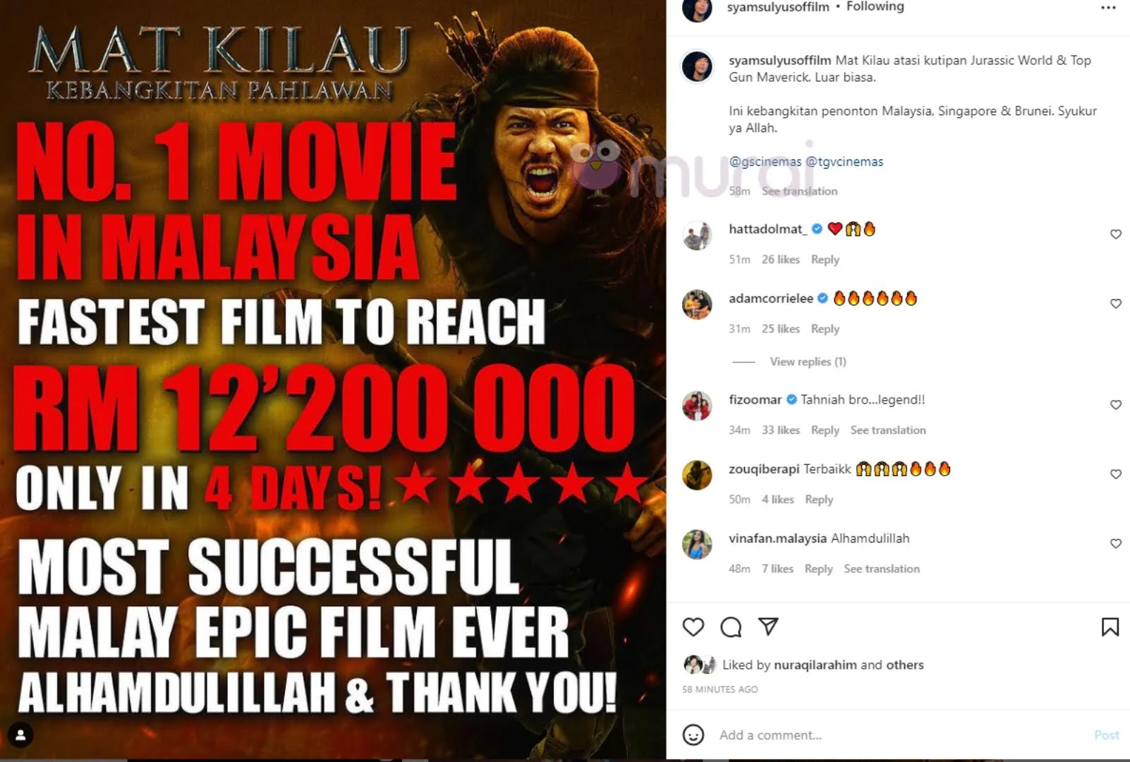 “Mat Kilau atasi kutipan Jurassic World & Top Gun Maverick. Luar Biasa. Ini Kebangkitan penonton Malaysia, Singapore & Brunei. Syukur Ya Allah.”-Kata Syamsul Yusof