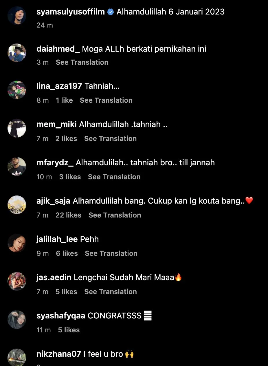 Di ruangan komen, rata-rata peminatnya mengucapkan tahniah dan mendoakan agar perkahwinan ini kekal hingga ke jannah.