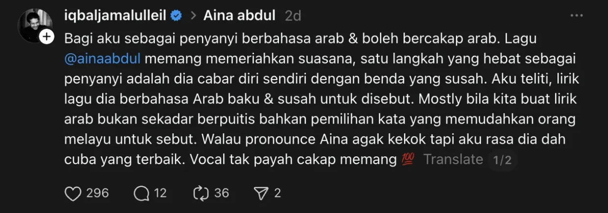 Walaupun dia mengakui sebutan Aina ada sedikit kekok, Syed Iqbal tetap melihat usaha itu sebagai sesuatu yang terbaik daripada penyanyi tersebut. Baginya, keberanian untuk mencuba sesuatu yang sukar sudah cukup membuktikan kualiti seorang artis.