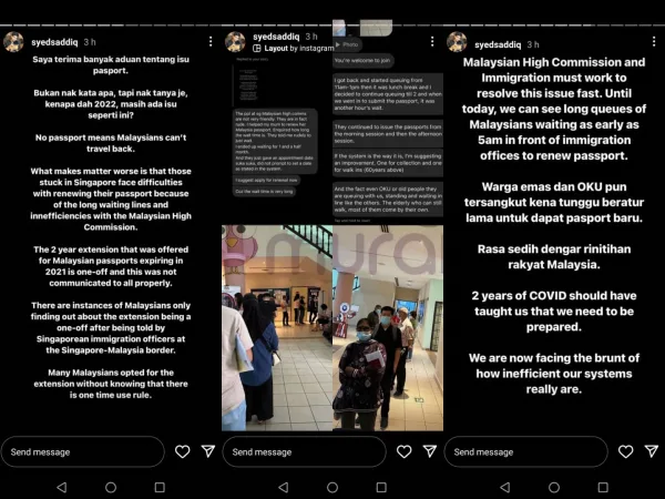 “Saya terima banyak aduan tentang isu passport. Bukan nak kata apa, tapi nak tanya je, kenapa dah 2022, masih ada isu seperti ini? Tak ada passport makna rakyat malaysia tak boleh balik semula.