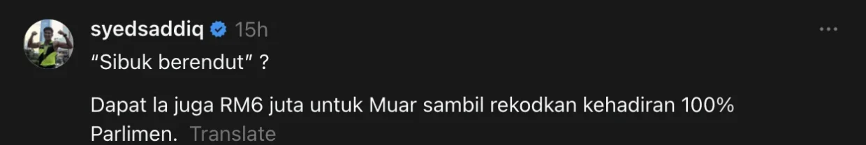 “‘Sibuk berendut’? Dapat la juga RM6 juta untuk Muar sambil rekodkan kehadiran 100% Parlimen.”
