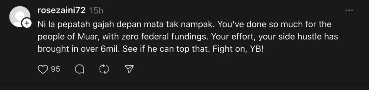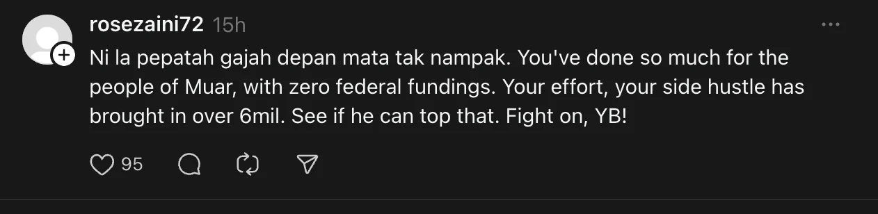 “Ni la pepatah gajah depan mata tak nampak. You’ve done so much for the people of Muar, with zero federal fundings. Your effort, your side hustle has brought in over 6mil. See if he can top that. Fight on, YB!”