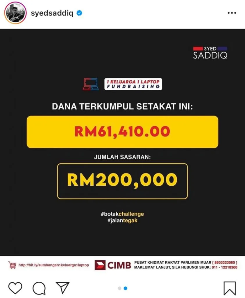 Jika dilihat pada IG Stories beliau, nampaknya ramai yang sudah menghulurkan bantuan wang. Sebelum ini melalui cara yang sama Syed Saddiq telah berjaya menyumbangkan sebuah komputer riba kepada 100 orang pelajar di kawasan beliau.