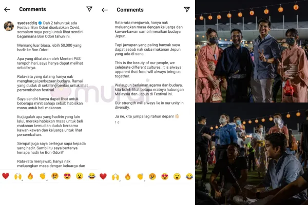 Dalam entri terakhir Syed Saddiq, presiden MUDA ini mengatakan meski berbeza agama dan budaya, namun hubungan dua negara antara Malaysia-Jepun dapat dieratkan menerusi festival seperti ini.
