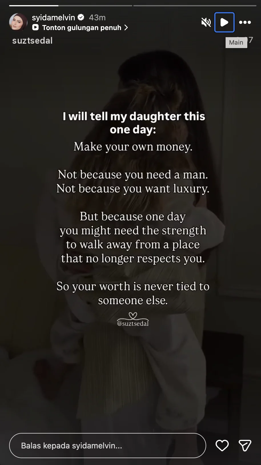 Menerusi repost itu, ia mengandungi nasihat kepada anak perempuan agar mencari duit sendiri bukan untuk kemewahan atau lelaki, tetapi sebagai kekuatan untuk diri sendiri. Malah, mesej itu turut menekankan bahawa wanita perlu berdikari untuk keluar daripada persekitaran yang tidak lagi menghormati mereka, serta mengingatkan bahawa nilai diri tidak sepatutnya bergantung kepada orang lain.