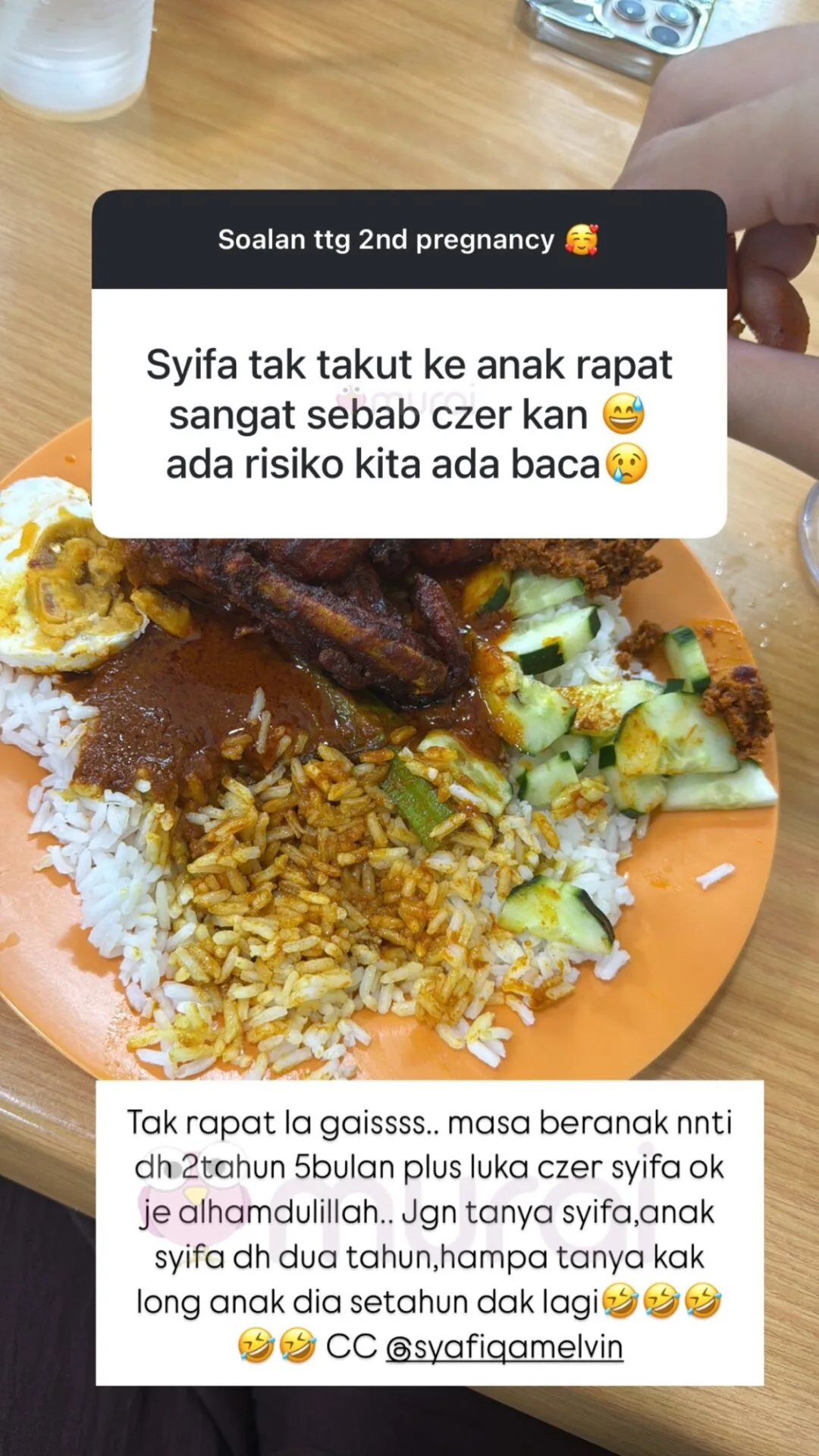 Di sebalik ramai yang meluahkan rasa teruja dengan kehamilan Syifa, segelintir netizen meluahkan rasa bimbang dengan jarak kehamilan yang dikatakan terlalu rapat selepas dia berkongsi pautan ‘Ask Me A Question’ mengenai kehamilan keduanya