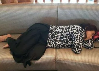 Satu gambar menunjukkan Menteri Maritim dan Perikanan, Susi Pudjiastuti nyenyak tidur di atas sebuah sofa di balai menunggu VIP di ...