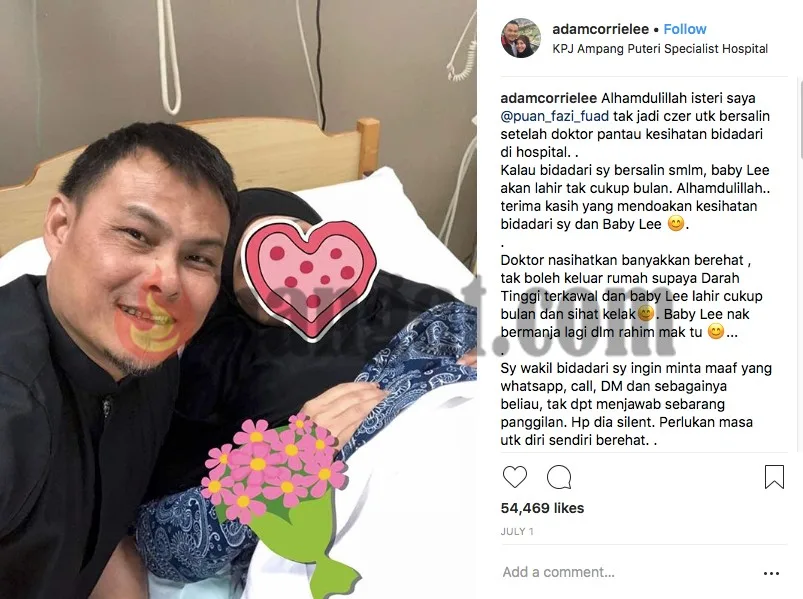 Adam Adam memberitahu isterinya selamat melahirkan anak mereka yang dipanggil sebagai Baby Lee itu sekitar jam 4 petang di KPJ Ampang Puteri Specialist Hospital, Ampang. Adam turut meluahkan rasa syukur yang tidak terhingga atas kelahiran cahaya matanya itu dan rata-rata peminat turut mengucapkan tahniah kepada Adam serta isterinya serta mendoakan kesejahteraan mereka sekeluarga. Tahniah diucapkan buat Adam dan isteri!