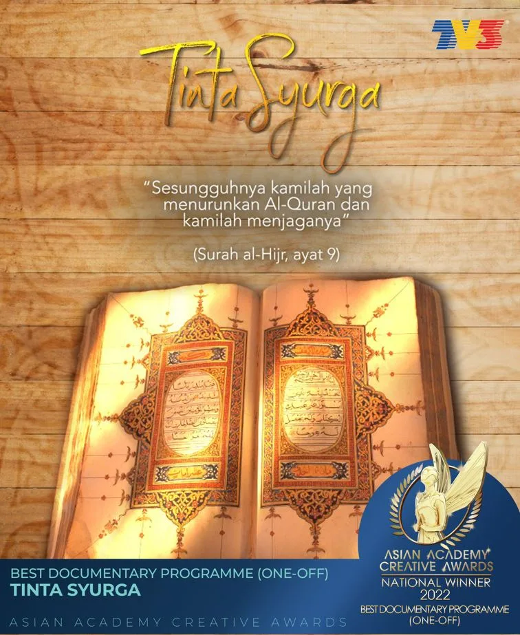 Dokumentari istimewa Nuzul Al-Quran yang bertajuk Tinta Syurga telah diumumkan sebagai pemenang anugerah Asian Academy Creative Award 2022 di bawah kategori Best Documentary Programme (One-Off).