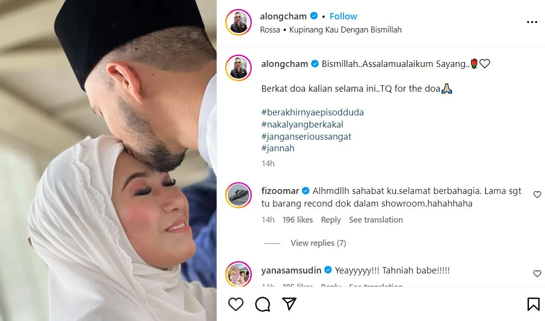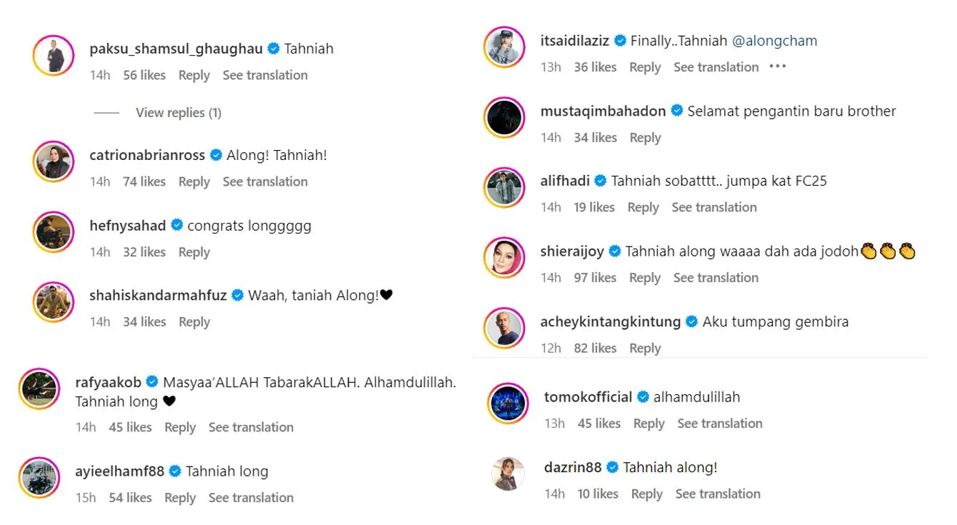 Melihat diruangan komen, ramai selebriti dan rakan artis turut menzahirkan rasa syukur di samping mengucapkan tahniah kepada Along atas perkhawinannya itu.