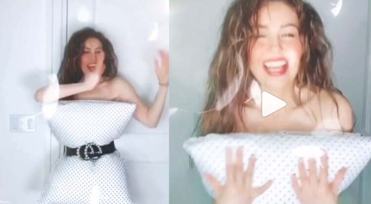 Thalia nampaknya mengikuti pillow challenge yang menggunakan bantal sebagai pakaian yang menutupi bahagian depan tubuhnya