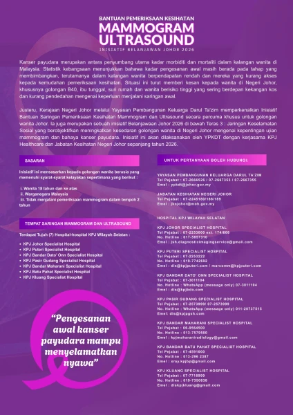 Berita baik buat semua wanita Johor, ini peluang yang memang worth it untuk kesihatan diri sendiri. Di bawah Belanjawan Johor 2026, satu inisiatif pemeriksaan Mammogram & Ultrasound Percuma diperkenalkan khusus buat golongan wanita di negeri ini. Program ini berada di bawah Teras 3: Jaringan Keselamatan Sosial dan digerakkan oleh Yayasan Pembangunan Keluarga Darul Ta’zim (YPKDT) dengan kerjasama KPJ Healthcare serta Jabatan Kesihatan Negeri Johor sepanjang tahun 2026. Kerajaan negeri nak wanita Johor lebih peka, lebih awal buat saringan dan lebih selamat.
