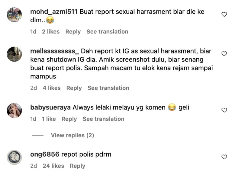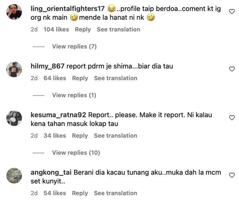 Menjengah ke ruangan komen, perkongsian Shima itu mendapat pelbagai reaksi daripada netizen yang mengecam tindakan lelaki miang tersebut serta turut meminta penyanyi itu membuat laporan polis.