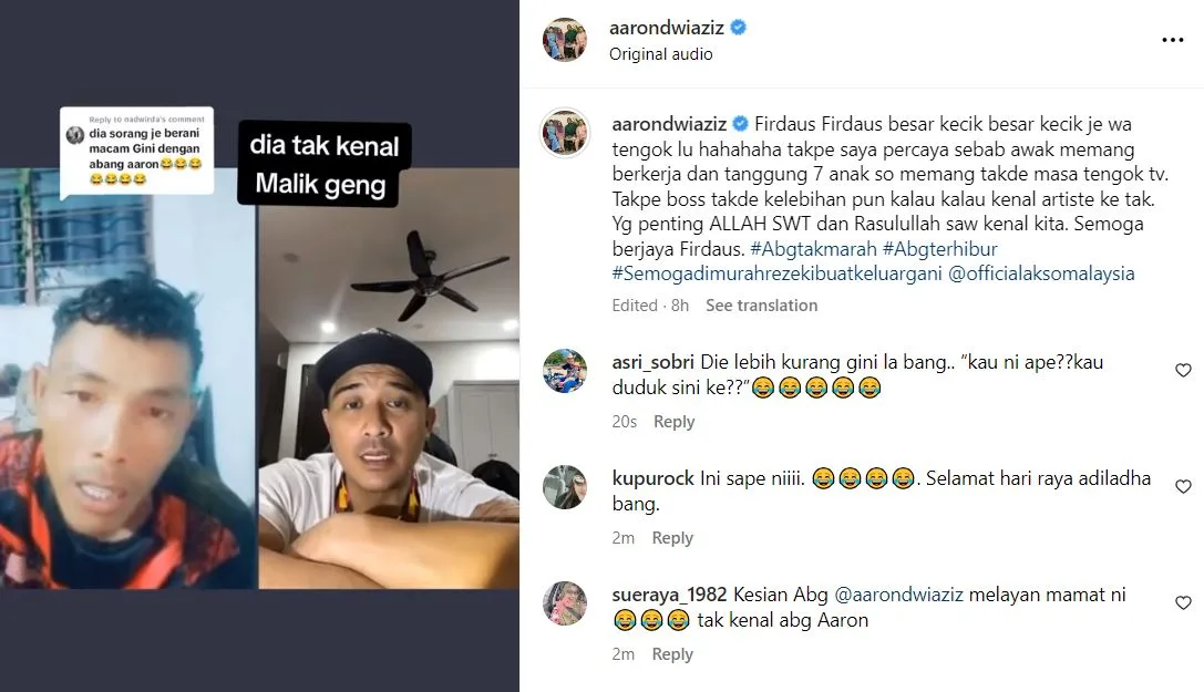 Dalam klip video tersebut, seorang lelaki memberitahu tidak mengenali Datuk Aaron Aziz ketika muncul dalam sesi siaran langsung di TikTok bersama aktor asal Singapura itu.