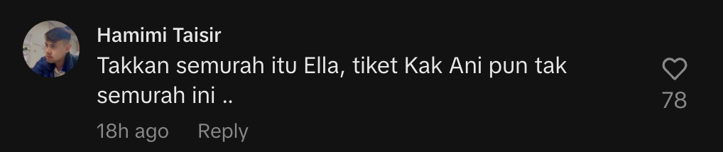“Takkan semurah itu Ella, tiket Kak Ani pun tak semuarah ini,” gurau seorang peminat, membuatkan ramai ketawa di ruangan komen.