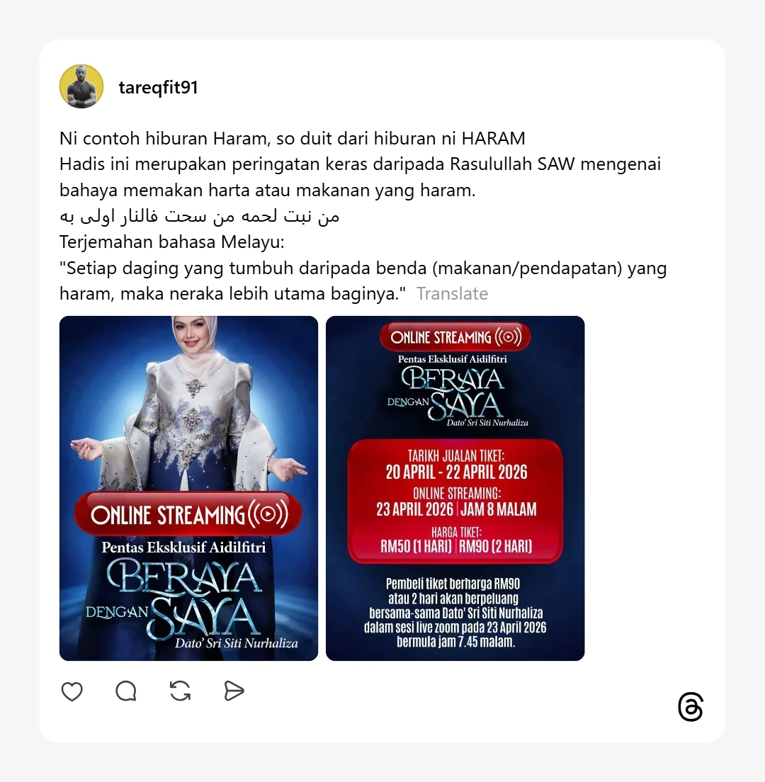 Tareq menerusi hantaran di Thread, turut memuatnaik poster Pentas Eksklusig Aidilfitri, Beraya Dengan Saya Dato’ Sri Siti Nurhaliza yang bakal diadakan secara online streaming. Tambah Tareq, dia menganggap konsert online streaming tersebut adalah salah satu contoh hiburan haram selain berpendapat wang hasil daripada hiburan terlibat juga haram.