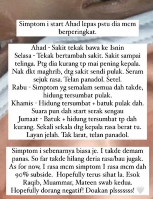 “Simptom i start Ahad lepastu dia macam berperingkat. Ahad-sakit tekak bawa ke Isnin. Selasa, tekak bertambah sakit. Sakit sampai telinga. Petang dia kurang tapi mai pening kepala. Nak dekat maghrib, datang sakit sendi pula. Seram sejuk rasa. Telan panadol selesai.
