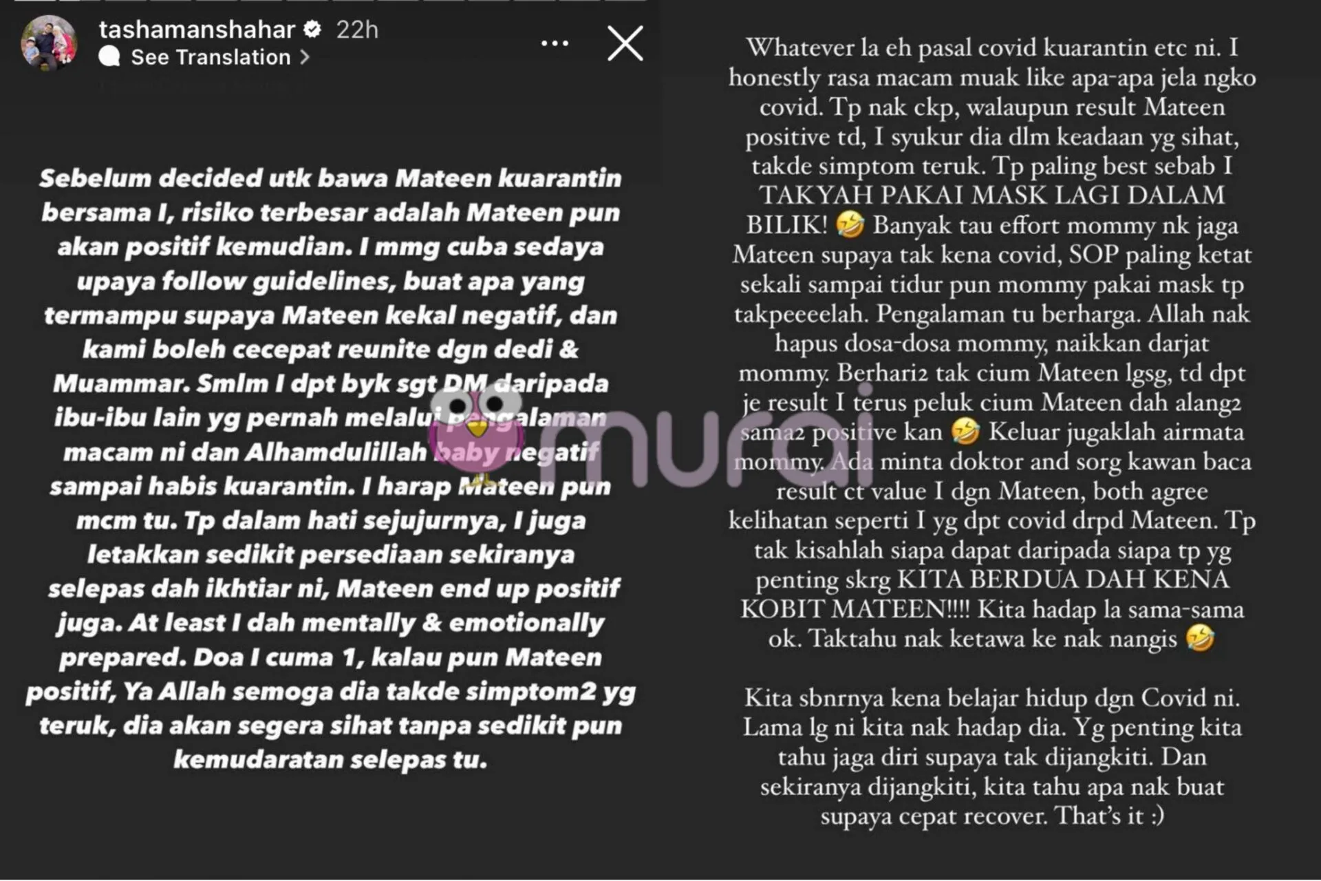 “Tapi nak cakap, walaupun result Mateen positive tadi, I syukur dia dalam keadaan yang sihat, takde symptom teruk.