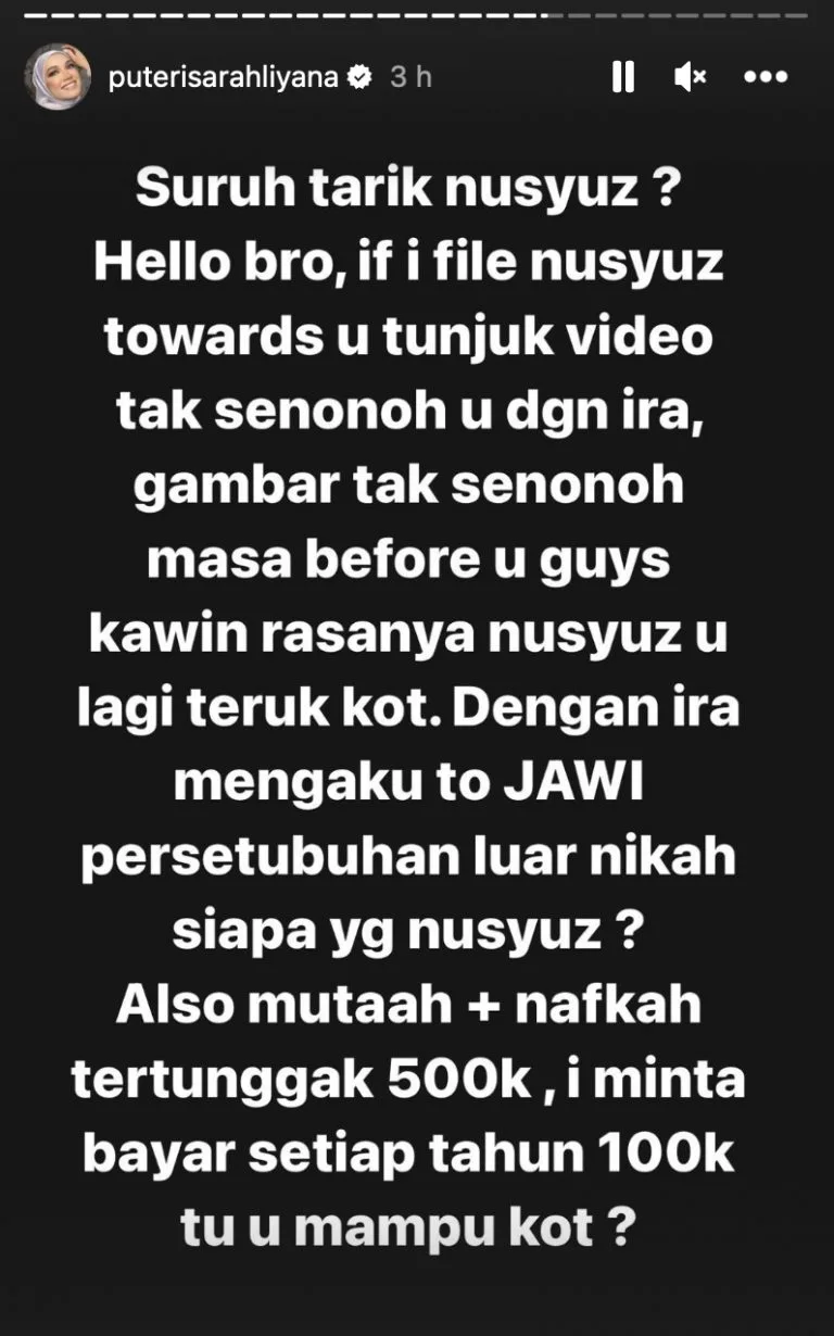 “Dengan Ira mengaku kepada Jabatan Agama Islam Wilayah Persekutuan (JAWI) persetubuhan luar nikah siapa yang nusyuz? Juga mutaah dan nafkah tertunggak RM500,000, saya minta bayar setiap RM100,000 setahun, itu awak mampu rasanya?,” dakwa Puteri Sarah menerusi hantaran berkenaan.