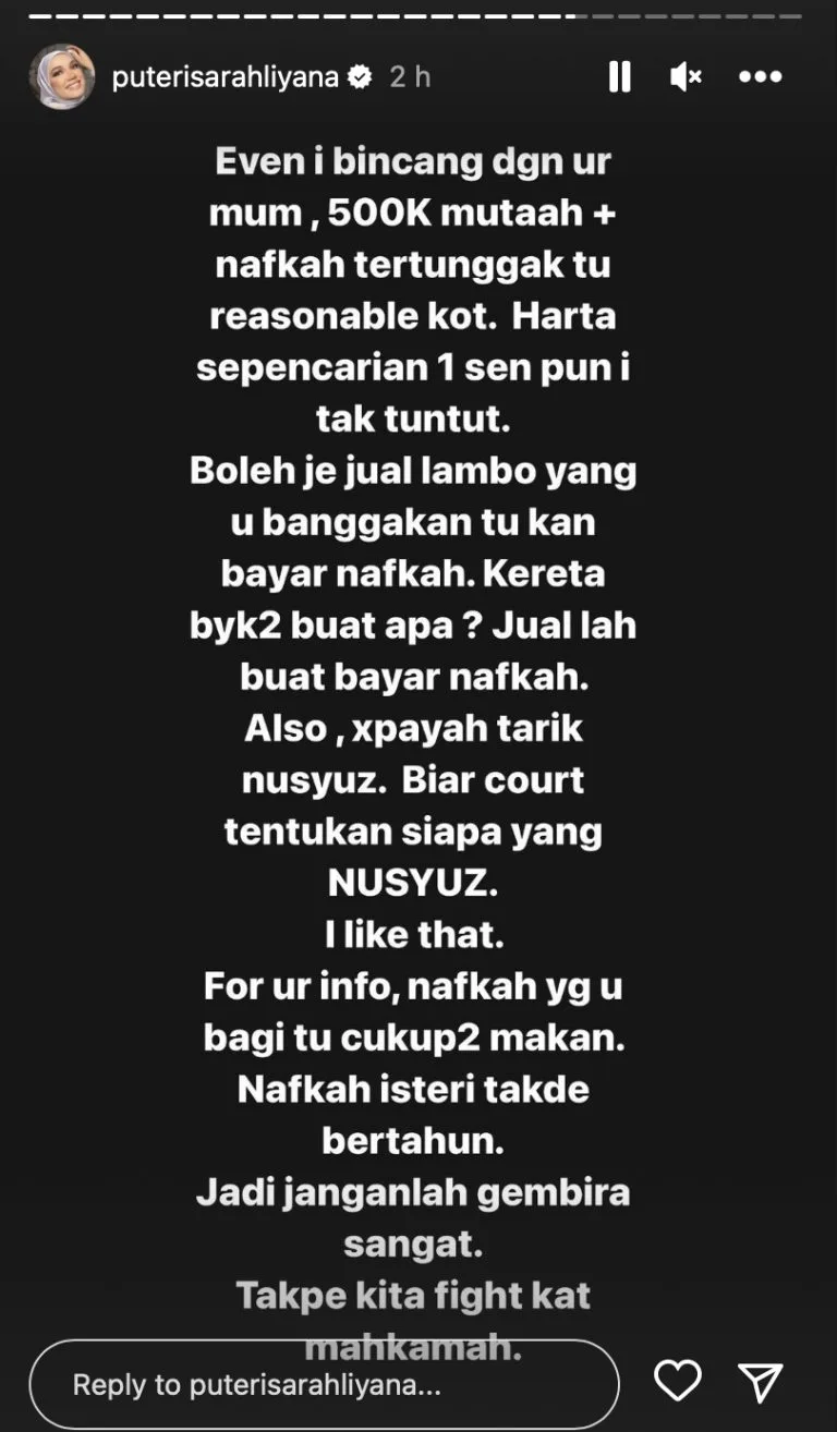 Terkini Puteri Sarah menerusi hantaran di Instagram, mendakwa dia mempunyai asbab yang lebih kukuh untuk memfailkan nusyuz terhadap suaminya.