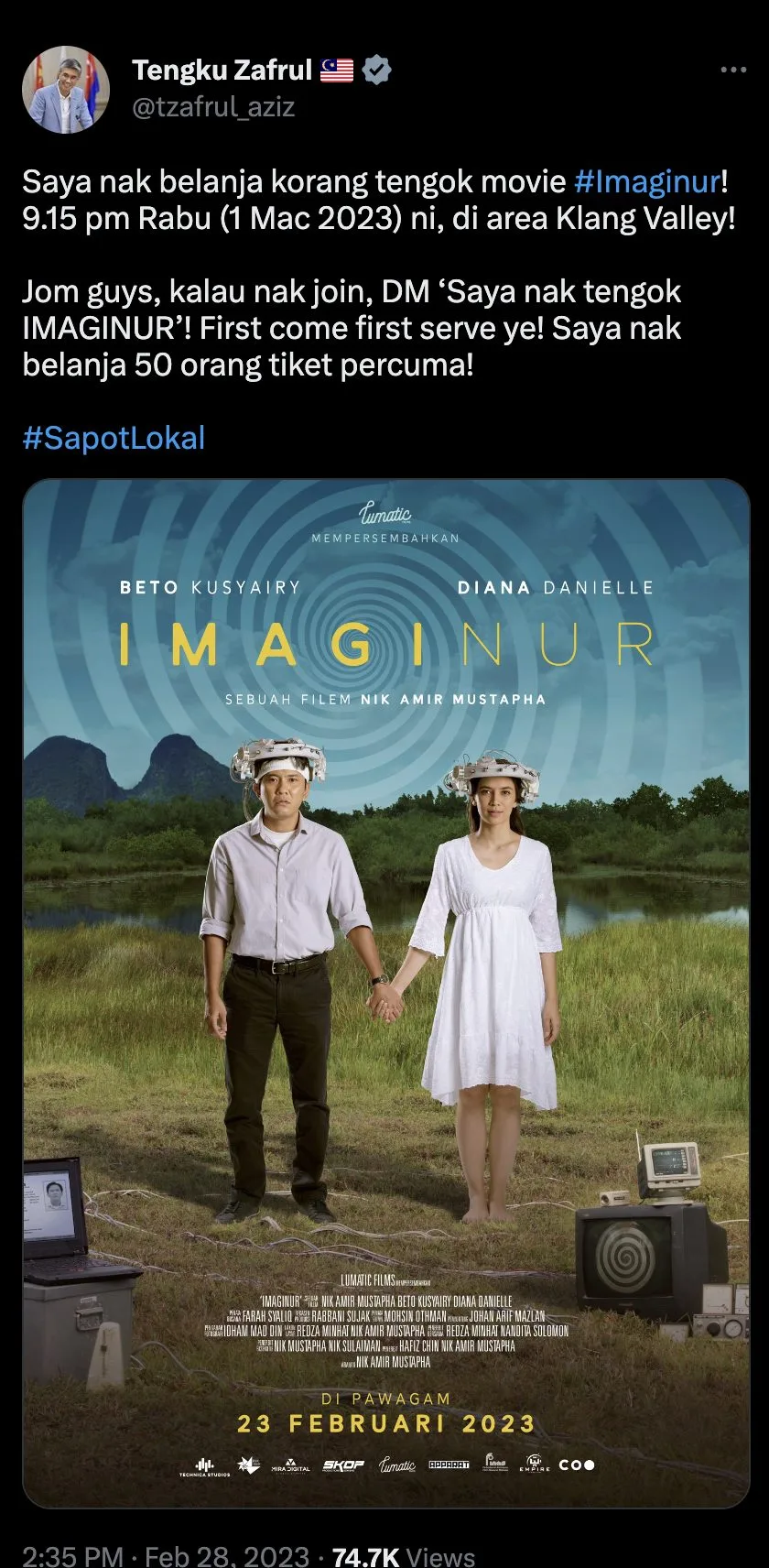 “Saya nak belanja korang tengok movie #Imaginur! 9.15 pm Rabu (1 Mac 2023) ni, di area Klang Valley! Jom guys, kalau nak join, DM ‘Saya nak tengok IMAGINUR’! First come first serve ye! Saya nak belanja 50 orang tiket percuma!”- tulisnya