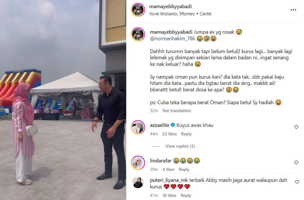 Perkongsian tersebut turut mendapat perhatian dari rakan-rakan artis dan juga bekas suami Abby iaitu aktor Norman Hakim yang meninggalkan komen mengatakan dia terkejut melihat perubahan bekas isterinya.