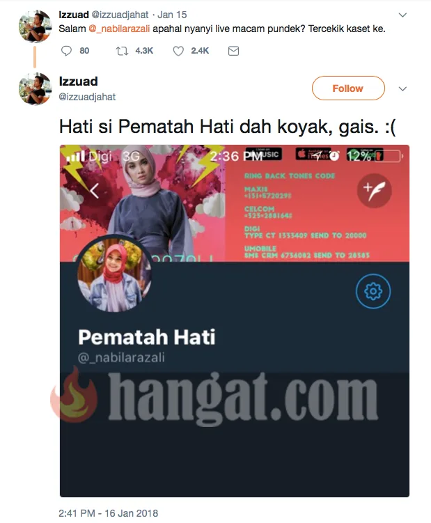Kerana lagu Pematah Hati, nama Nabila Razali terus menjadi perhatian. Bermula dengan gimik pelancaran lagu itu sehinggalah minggu ini, nama Nabila sekali lagi menjadi sebutan para netizen.