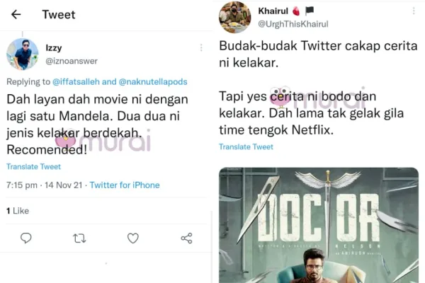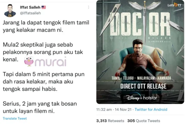 Tular di media sosial baru-baru ini bila mana ramai pengguna Twitter kecoh mengenai filem Tamil berjudul ‘Doctor’, jalan cerita yang lucu dan menghiburkan serta lakonan pelakon yang hebat membuatkan warganet berkongsi pandangan mereka terhadap filem ini.