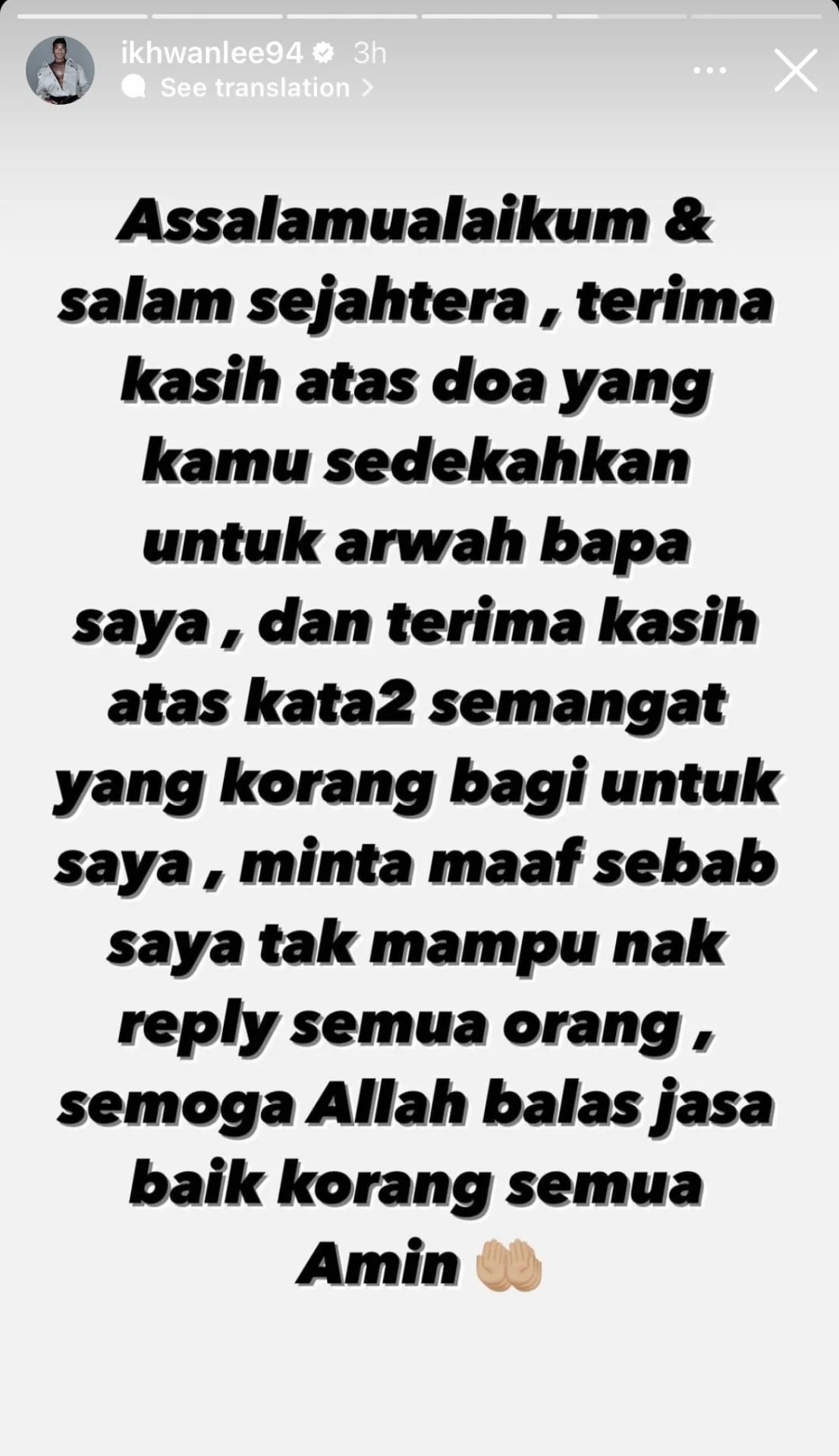 “Assalamualaikum dan salam sejahtera. Terima kasih atas doa yang kamu sedekahkan untuk arwah bapa saya dan terima kasih atas kata-kata semangat yang korang bagi untuk saya.