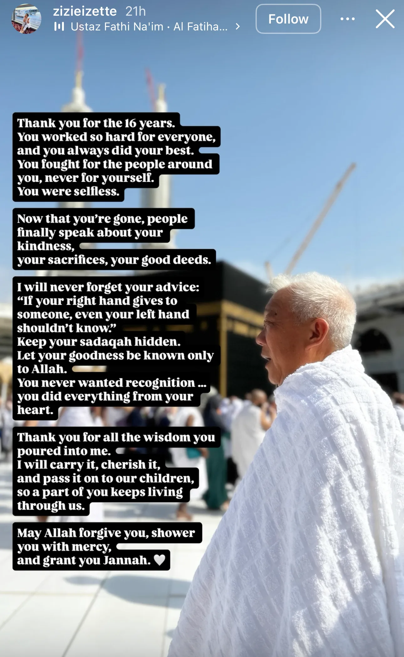 Menerusi Instagram Story terbaharunya, Zizie memuatnaik foto suaminya yang berdiri di hadapan Kaabah ketika menunaikan ibadah Umrah itu turut menitipkan ucapan terima kasih untuk selama 16 tahun mereka bersama selain menyifatkan arwah suaminya itu telah bekerja keras untuk semua orang.