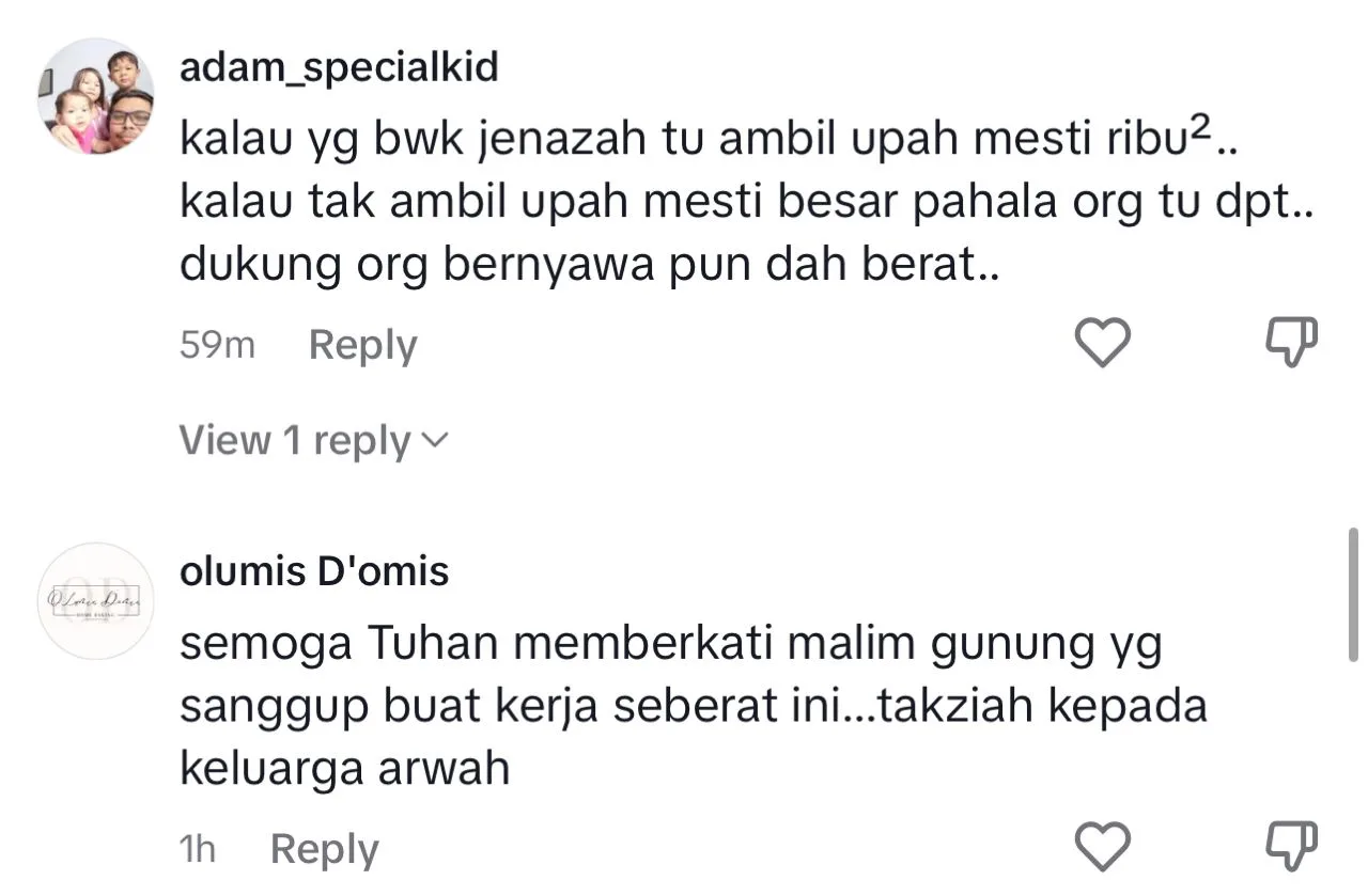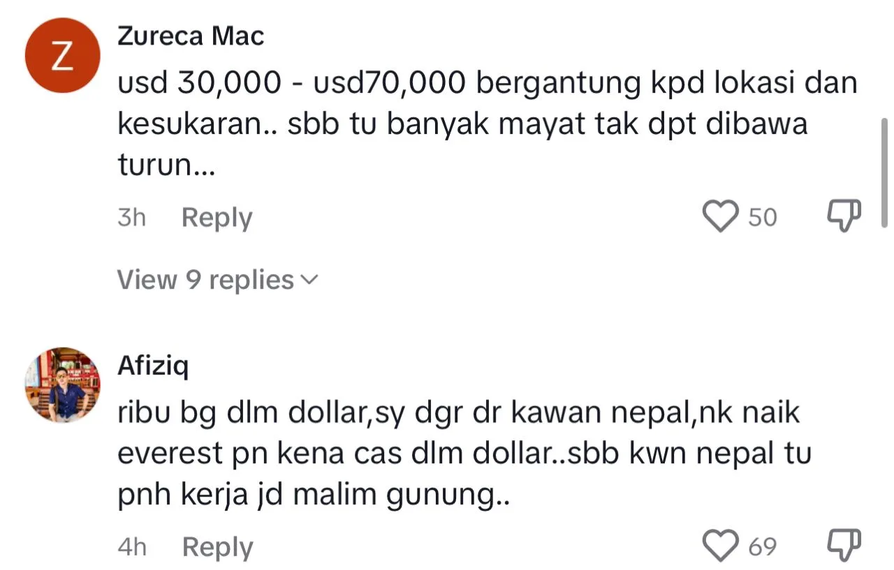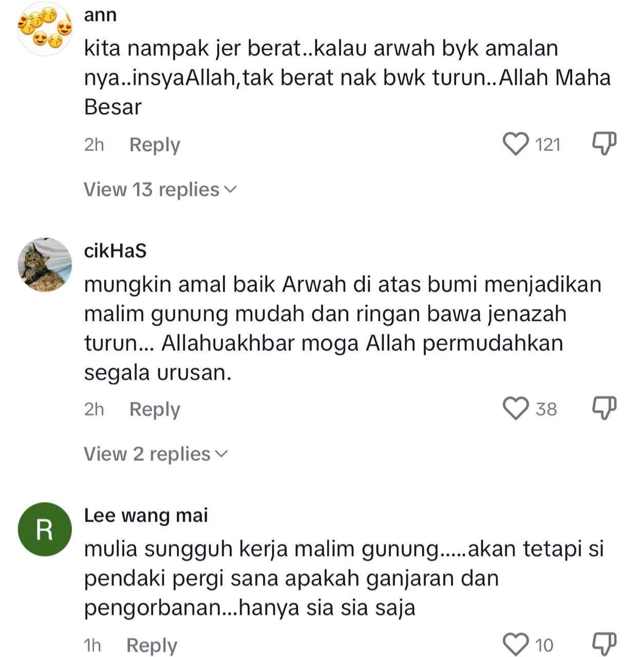 Menjengah ke ruangan komen, rata-rata warganet ingin mengetahui berapakah bayaran yang diterima oleh malim gunung yang diberi tanggungjawab membawa pulang jenazah dengan kesukaran darjah ketinggian gunung tersebut.