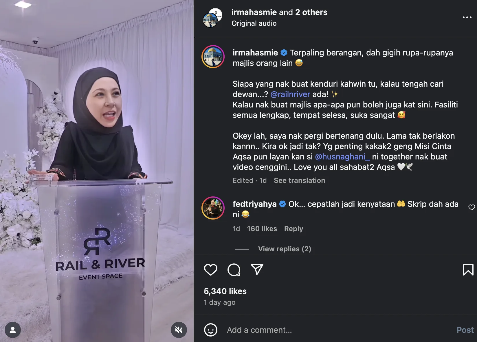 Bukan itu sahaja, Irma turut membayangkan suasana seperti majlis sebenar apabila menyebut detik namanya dan pasangan disebut oleh pengacara majlis, seolah-olah dia benar-benar berada dalam majlis pernikahan sendiri. Tindakannya itu mengundang pelbagai reaksi daripada netizen, ada yang teruja, tidak kurang juga yang terus meneka apakah pelakon drama Kasih Alia itu sedang bersedia untuk membuka lembaran baharu dalam hidupnya.