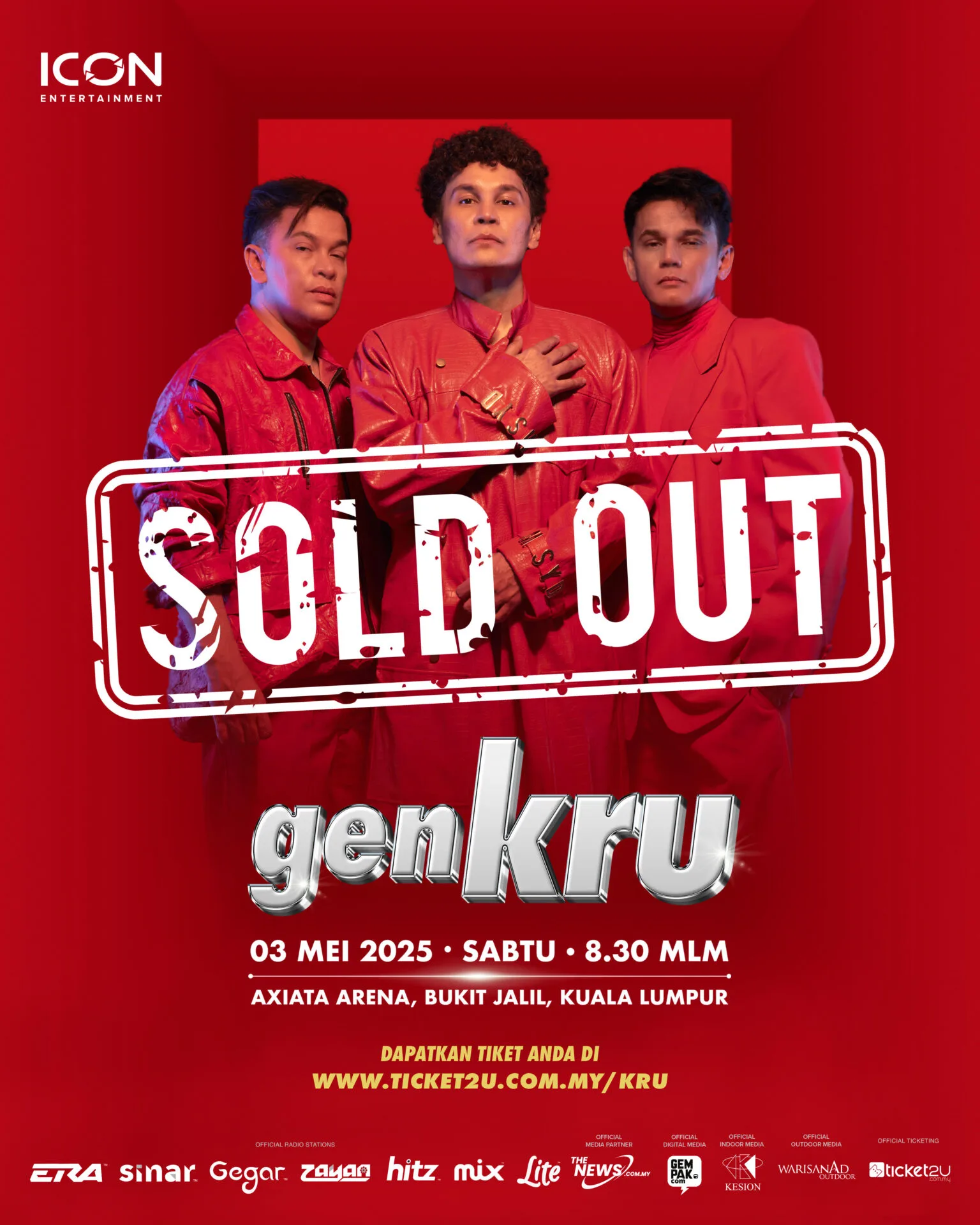 Pihak penganjur, Icon Entertainment menitipkan ucapan terima kasih buat semua peminat KRU yang berjaya membuatkan tiket Konsert GenKRU ‘sold out’ pada pukul 12 tengah hari tadi.