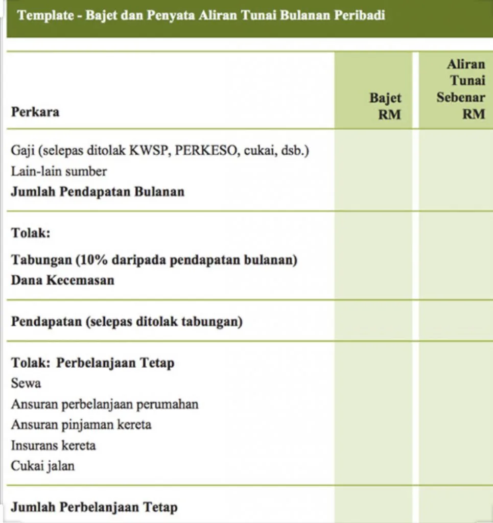 Letakkan satu tabiat sentiasa menyenaraikan perbelanjaan dan apa jua keperluan seperti perbelanjaan harian, bil utiliti, hutang PTPTN, hutang kereta, hutang rumah, insuran dan hutang bulanan lain yang perlu diselesaikan agar kita tahu kemana wang kita disalurkan dan ini juga akan dapat mengawal untuk perkara yang tidak perlu. Dengan ini, kita dapat mengira baki wang dan selebihnya boleh dijadikan sebagai simpanan atau tabungan.