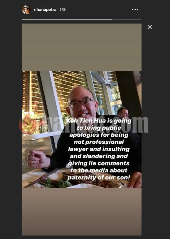 Dalam perkembangan lain, Rihana turut berkongsi satu lagi posting di laman Insta-story nya. Di dalam perkongsian tersebut, Rihana telah menuntut permohonan maaf secara terbuka kepada Koh Tien Hua, peguam kepada Sultan Kelantan menerusi firma guaman Eversheds Harry Elias LLP yang berpangkalan di Singapura yang mana dia dikatakan telah memberi maklumat palsu kepada pihak media mengenai status anaknya.