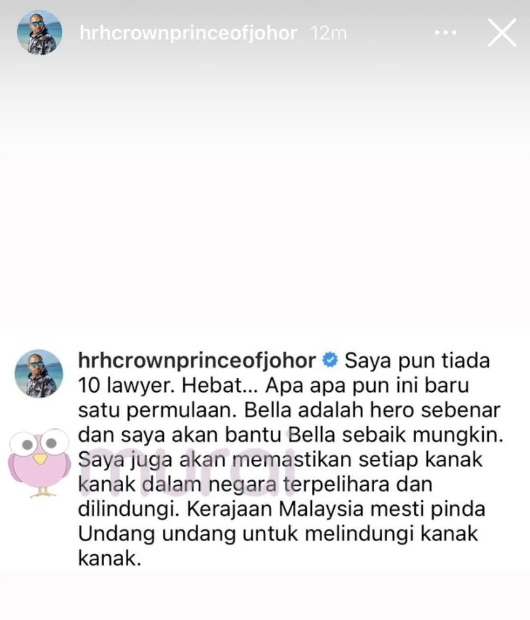 Menerusi Insta Stories, baginda memberitahu dirinya sendiri tidak memiliki seramai 10 orang peguam apabila mengetahui pengasas Rumah Bonda, Siti Bainun memiliki seramai 10 orang peguam untuk mempertahankan dirinya berikutan kes penderaan Bella.