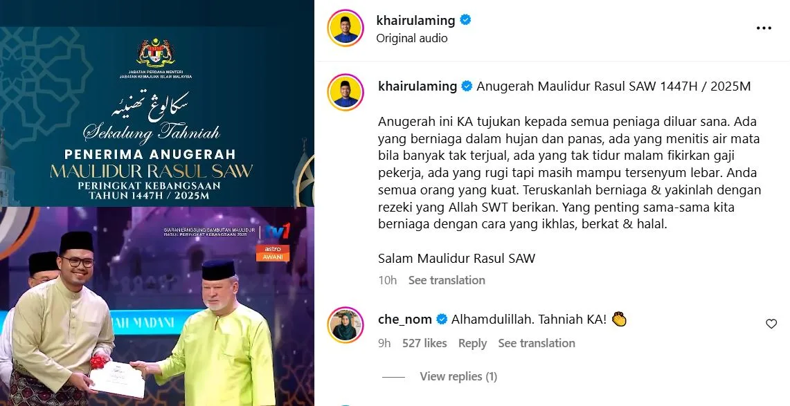Pempengaruh dan usahawan terkenal, Khairul Aming, meluahkan rasa terkejut apabila diumumkan sebagai salah seorang penerima Anugerah Tokoh Maulidur Rasul (Usahawan) 2025.