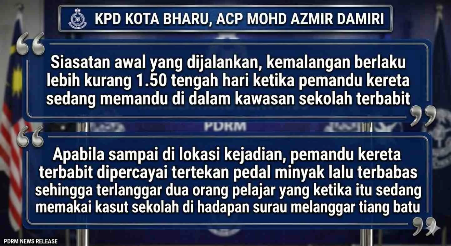 Menurut maklumat awal pihak berkuasa, sebuah kenderaan yang dipandu wanita berusia 57 tahun dipercayai hilang kawalan sebelum merempuh dua pelajar perempuan yang berada di kawasan hadapan surau sekolah.