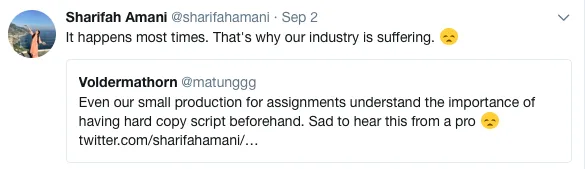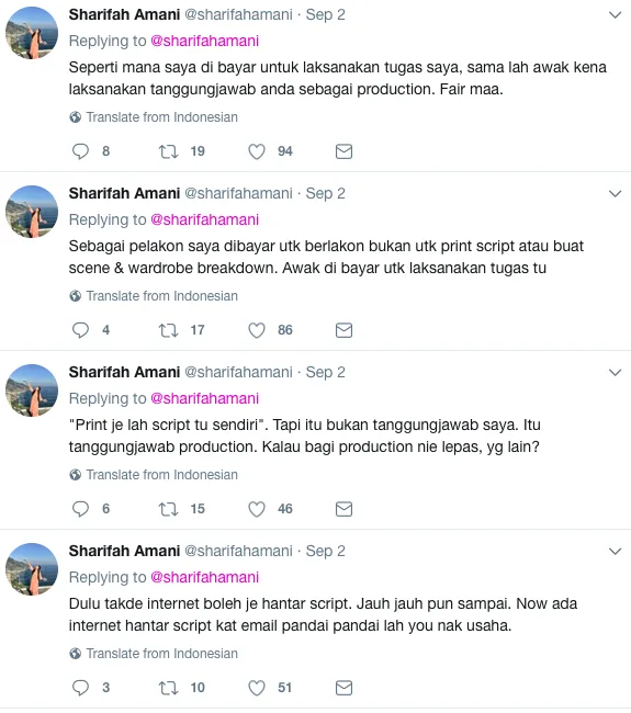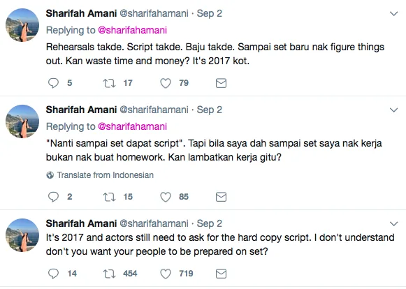 Di dalam tweet tersebut, anak kepada pelakon Fatimah Abu Bakar ini telah mempersoalkan mengenai tanggungjawab produksi mengedarkan skrip lakonan yang kemudiannya meminta para pelakon mencetaknya sendiri.