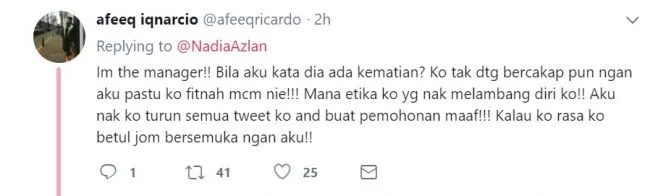 Janna Nick dituduh buat hal dengan penganjur satu acara di ibu kota. Dia dikatakan lewat tiba di lokasi dan memberi alasan mengenai kelewatannya itu. Tidak mendiamkan diri, sebagai pengurus Janna, Afeeq membalas tweet Nadia itu dan mengatakan dia tidak pernah pun menggunakan alasan ada kematian kerana kelewatan Janna. Afeeq juga meminta Nadia memadam tweet berkenaan dan bersemuka dengannya.