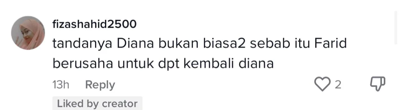 Semalam, Farid mendedahkan keretakan rumah tangga bersama Diana berpunca daripada kehadiran orang ketiga. Menurutnya, dia mendakwa menghidu mengenai kecurangan isterinya sejak tahun lalu.