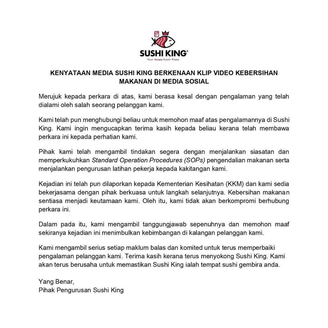 Berikutan video itu telah tular di media sosial dan menimbulkan pelbagai reaksi orang ramai, pihak Sushi King tampil memberikan kenyataan bahawa pihak mereka telah menghubungi pelanggan tersebut untuk memohon maaf atas pengalamannya di Sushi King.