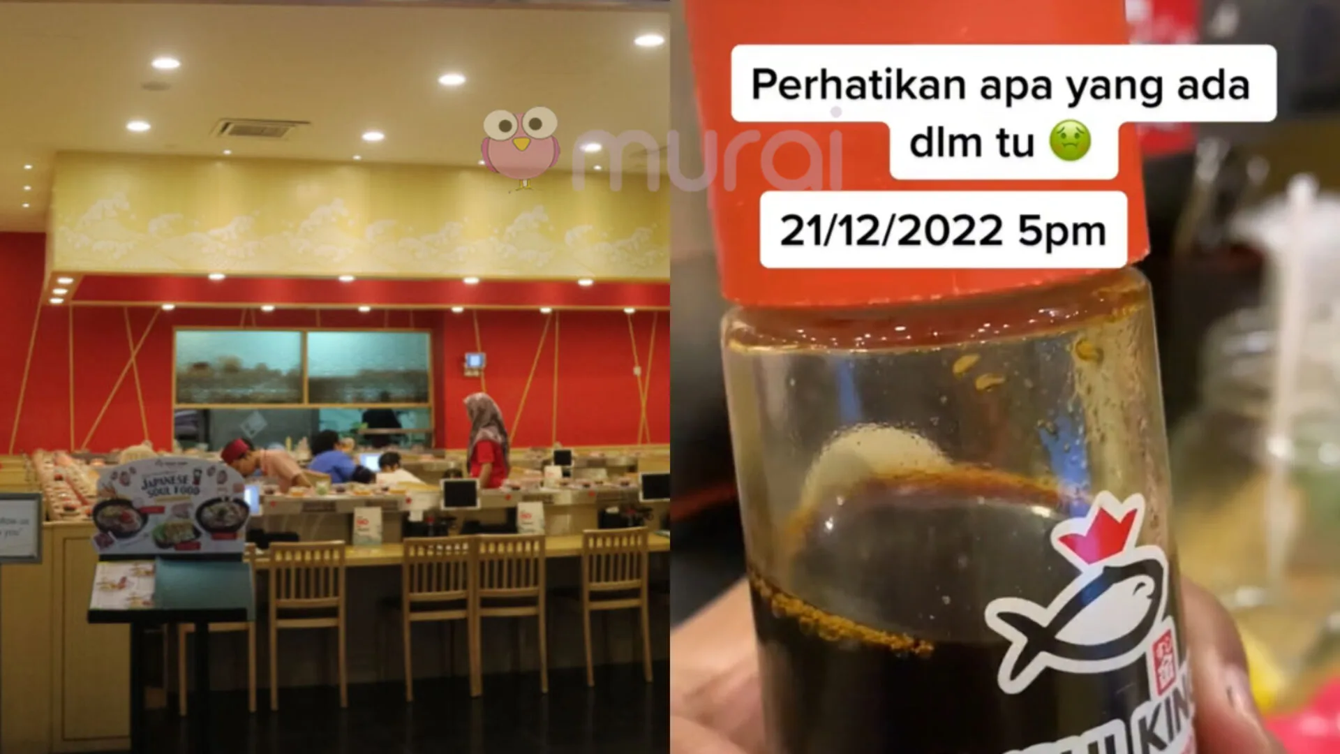 Menurut pengguna TikTok yang dikenali sebagai @Dyra Salleh, dia menyedari terdapat ulat dalam kicap yang dihidangkan setelah dia selesai makan di restoran sushi berkenaan pada 21 Disember baru-baru ini.