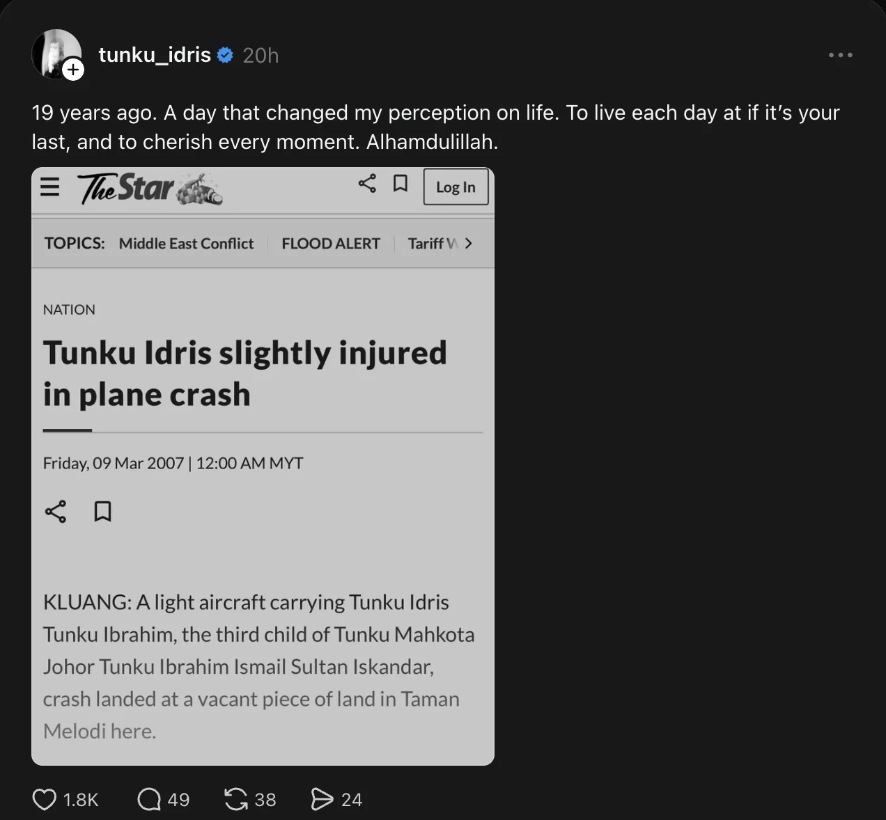 Menerusi perkongsian di Threads, Tunku Idris memuat naik keratan akhbar lama yang memaparkan tragedi kemalangan pesawat ringan pada tahun 2007. Insiden tersebut dilaporkan berlaku di kawasan Taman Melodi, Kluang apabila pesawat berkenaan terhempas ketika mendarat.